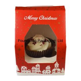 Present your Single cupcake with a wow! These Premium Gable Christmas Cupcake Window Box with single cupcake 6cm holder show off a beautiful festive print with a clear acetate window, perfect for transporting to customer, friends and family! Flat packed in 25's and they can be assembled with ease!