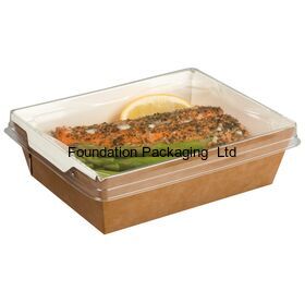 It is made from printed kraft effect board and has a PE coating to the interior which acts as a moisture and grease barrier. The lids have corner grips for easy and secure closing and align with the bases for on-shelf stacking.